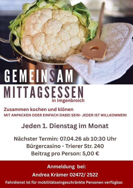 - Di. 07.04. Gemeinsam Mittagessen (M.U.T.), 10-14 Uhr, Bürgercasino